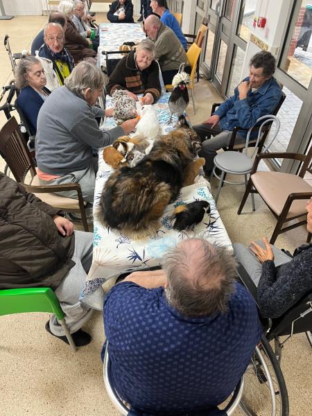 La zoothérapie est un moment que les résidents apprécient particulièrement. Autour de tables, ils peuvent échanger, caresser et nourrir les animaux.🤗